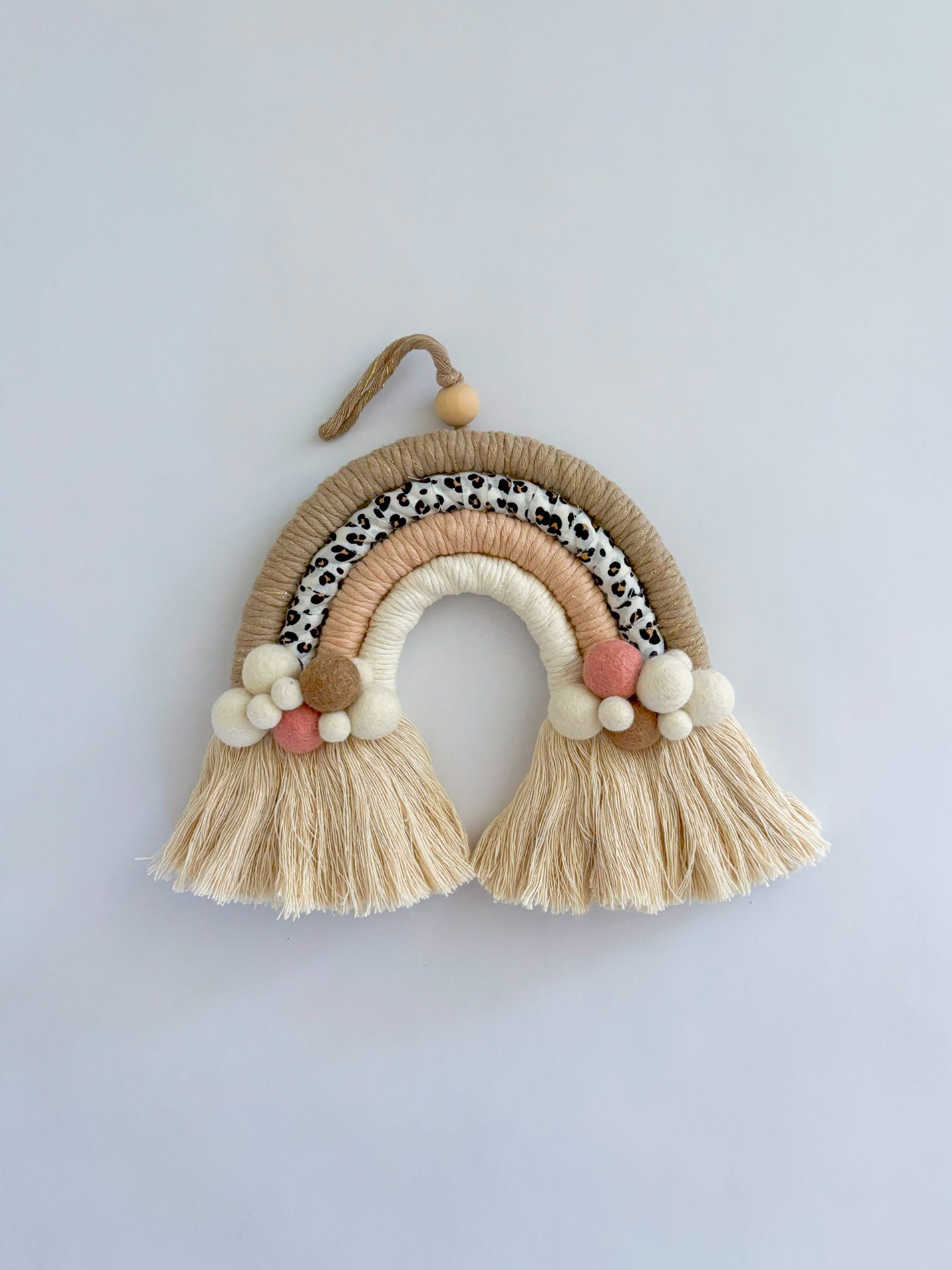 Ripustettava sateenkaarikoriste, huopapalloilla. Leveys noin 20-22 cm